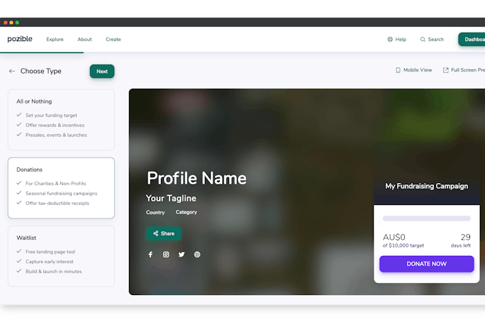 Create a compelling campaign page complete with a mission statement, images & video to capture your audience's hearts and launch with confidence knowing the expert Pozible team is ready to help you each step of the way.