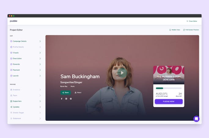 Create, edit and run your campaign from the one place with the Project Editor. See a live preview of your campaign page, current supporter data & post updates on the fly. Connect with your supporter with a group message feature or direct message them from within the Pozible platform. Add in new Stretch Targets once you meet your goal, update Reward quantities and view your crowdfunding campaign statement once your campaign ends.