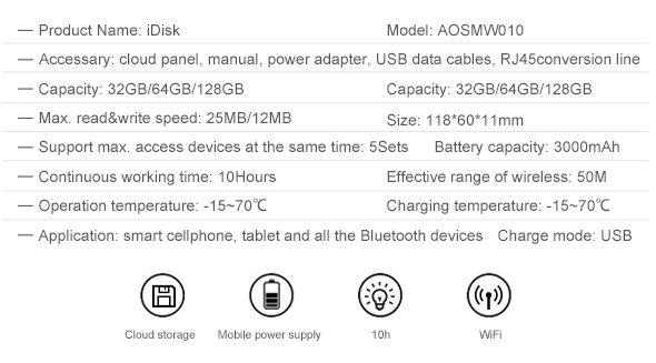 An iDisk is the equivalent to 3000 mA portable power bank and can charge for your mobile device or tablet at any time. In addition, it has a battery life of over 10 hours!