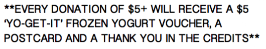 It’s actually pretty simple! We’re not just going to take your money and run. We have some pretty great rewards in return for your generosity, most of which are exclusive to this fundraiser! We also have some cool sponsored prizes like MOVIE TICKETS and FROZEN YOGURT VOUCHERS! Imagine getting both?!