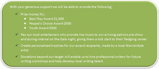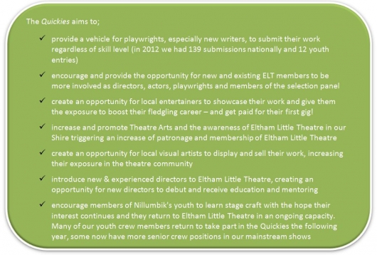 In previous years, Eltham Little Theatre has received a much appreciated grant from the local Nillumbik Shire council to assist presenting the Quickies. Unfortunately, the council is unable to provide the usual grant this year. This is where you come in! Rather than let The Ten Minute Quickies disappear from the performing and visual arts calendar, Eltham Little Theatre is committed to continuing to provide the event to encourage and foster up-and-coming visual and performing artists. To this end, we seek your support to make it pozible again in 2014!