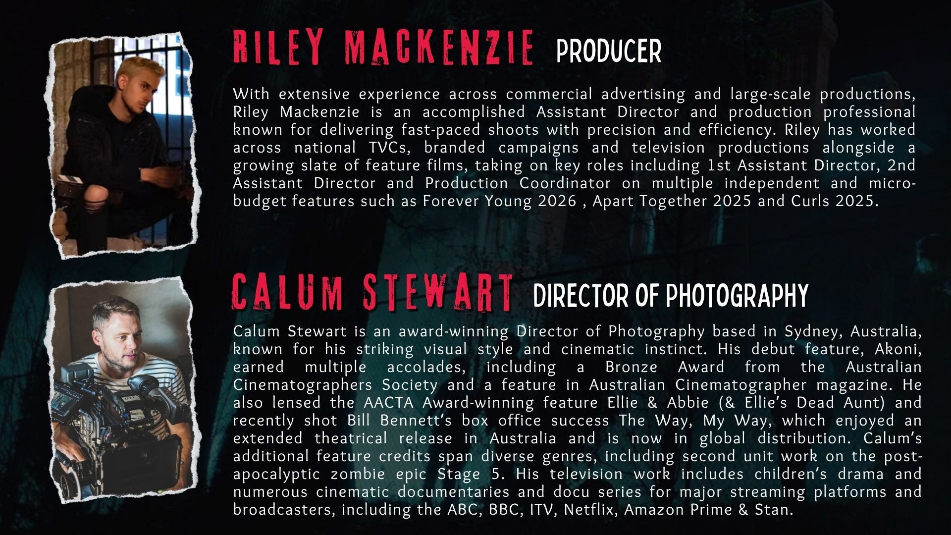 Logline: In the heart of the Aussie bush, a deadly virus fractures the minds of four troubled souls, a pair of estranged identical twins and two toxic best friends. As the virus consumes them, the pairs face haunting memories proving no one is innocent.