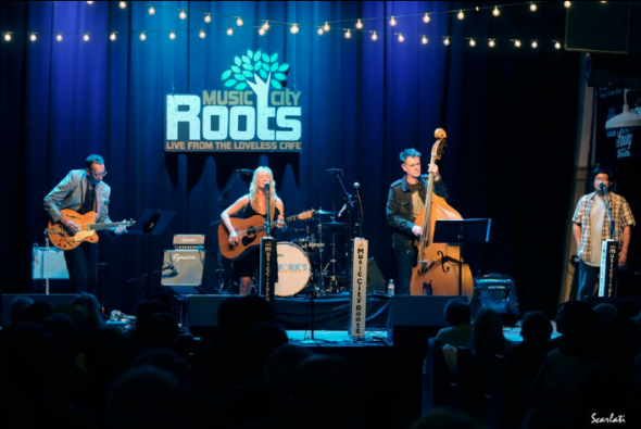 Ange live on stage with the band members of the new album 'Into The Wind': John Jackson (Guitar), Bones Hillman (Upright Bass) and Marc Lacuesta (Backing Vocals) Music City Roots, Nashville USA. Photo credit: Anthony Scarlati (USA)