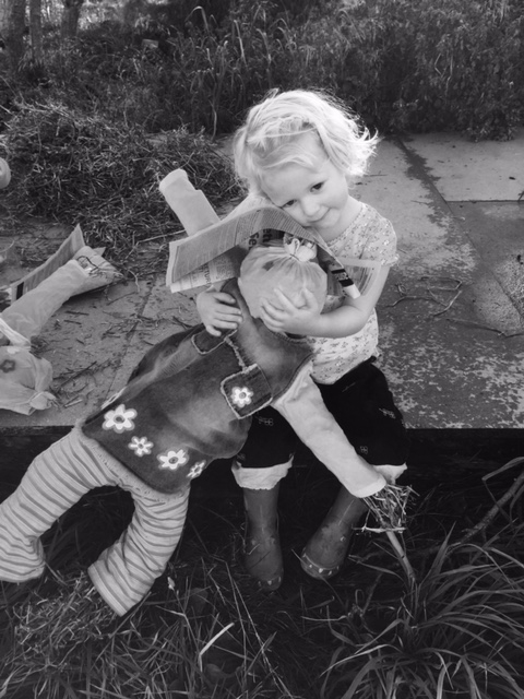 Hattie now - hugging the scarecrow we made at home