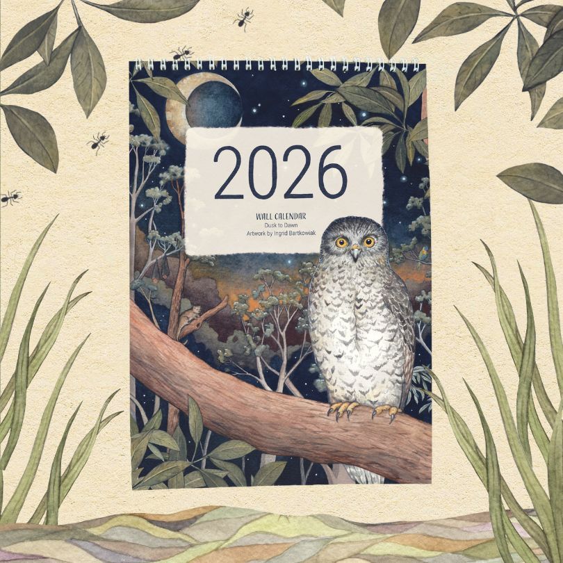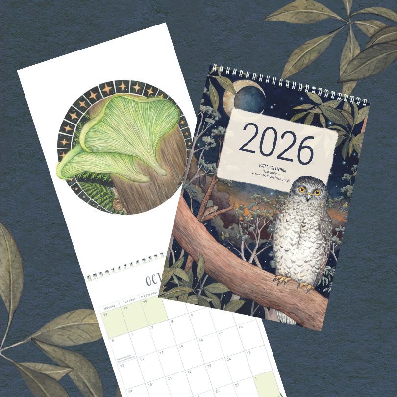Hello! My name is Ingrid, I’m an Australian illustrator and artist and I’m launching pre-orders for my 2026 illustrated wall calendar - this year the theme is 'from Dusk to Dawn'. We'll be visually exploring what comes to life in the natural world when the sun goes down - flying foxes, bioluminescent fungi, turtles hatching and more!