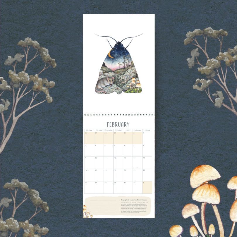 The artworks in this calendar are completely hand painted in watercolour and gouache. My hope is that the paintings in this calendar can act as a way to spark interest and learn more about (and appreciate!) some of the incredible flora, fauna and fungi we have on this planet, and why it’s important to preserve its biodiversity. There will also be a QR code included on the back which links to more information about themes explored in each painting.