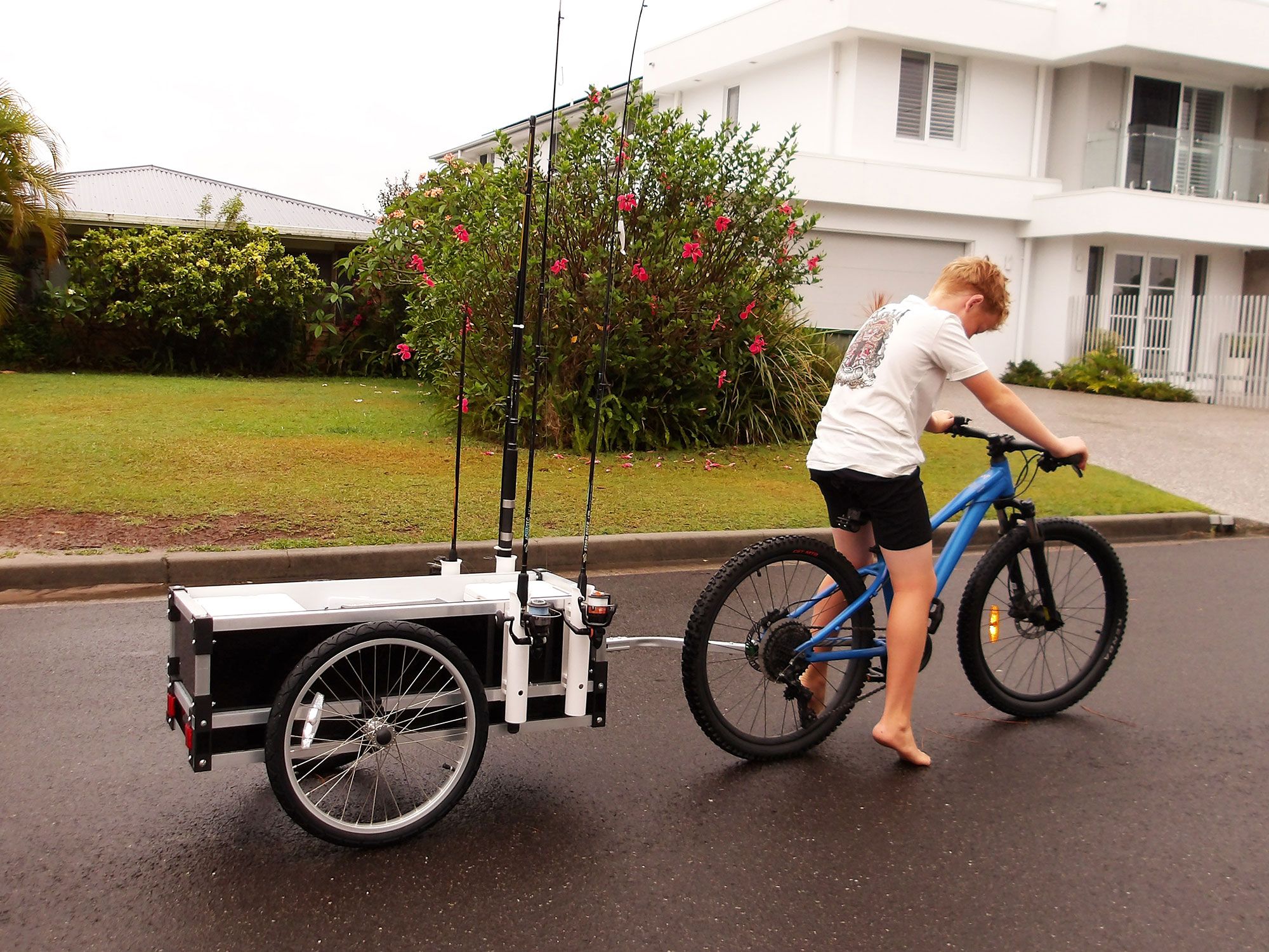The waterproof fabric liner stops smaller gear from falling through, covers everything like a lid, and comes off easily for cleaning. The Fishmobile has three points of contact for balance, so it won’t tip over even when fully loaded. We’ve checked Australian Safety Standards and added reflectors and signs so it’s safe and easy to spot.