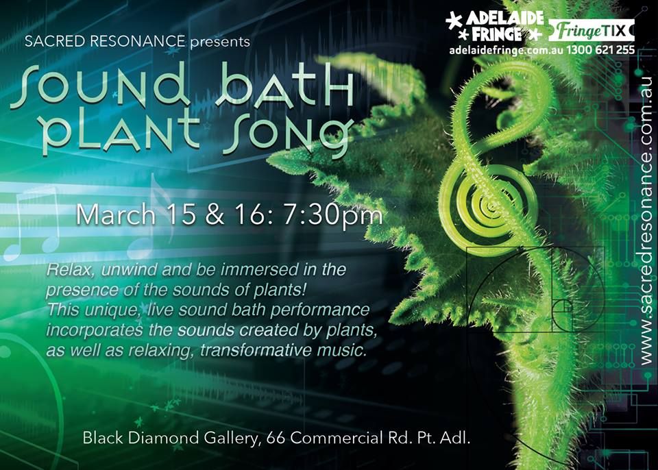 2 for 1 tix - Plant Song Sound Bath at Adelaide Fringe Relax, unwind and be immersed in the presence of the sounds of plants! This unique, live sound bath performance incorporates the sounds created by plants, as well as relaxing, transformative music. March 15 & 16 @ 7:30pm at Black Diamond Gallery - Port Community Arts Centre 66 Commercial Rd, Port Adelaide, Link: https://adelaidefringe.com.au/fringetix/sound-bath-plant-song-af2019? Presented by Sacred Resonance