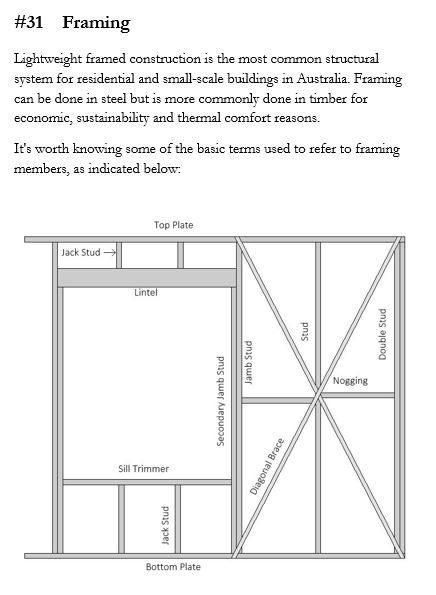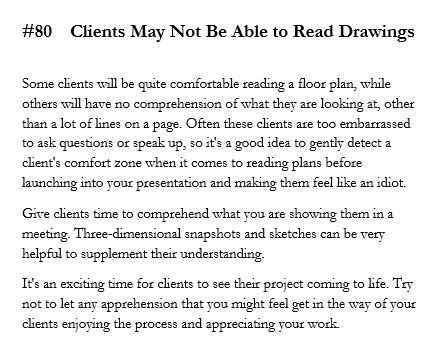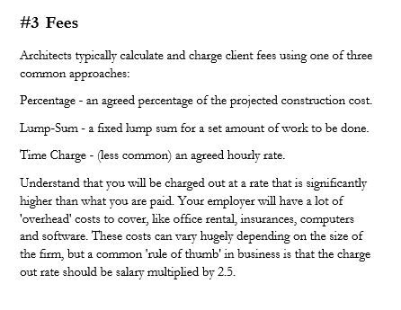 I’ve compiled a list of 101 things I wish I knew before my first architecture job. It covers basic information about architecture firms and business, professional drafting, introductory technical construction knowledge, ecologically sustainable design, regulatory compliance, working with clients, specifying, and self-development. It discusses all of these things in simple language and assumes you have no prior knowledge.