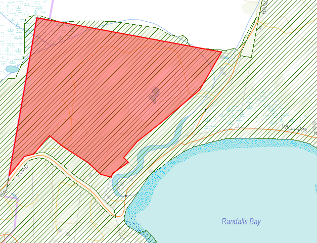 The red-shaded area outlines the block boundaries in relation to Randalls Bay beach area.